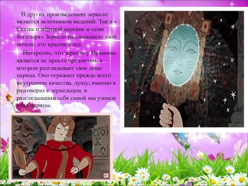видений. Так в « Сказке о мёртвой царевне и семи богатыря» Зеркало рассказывало злой мачехе, кто красивее нее.