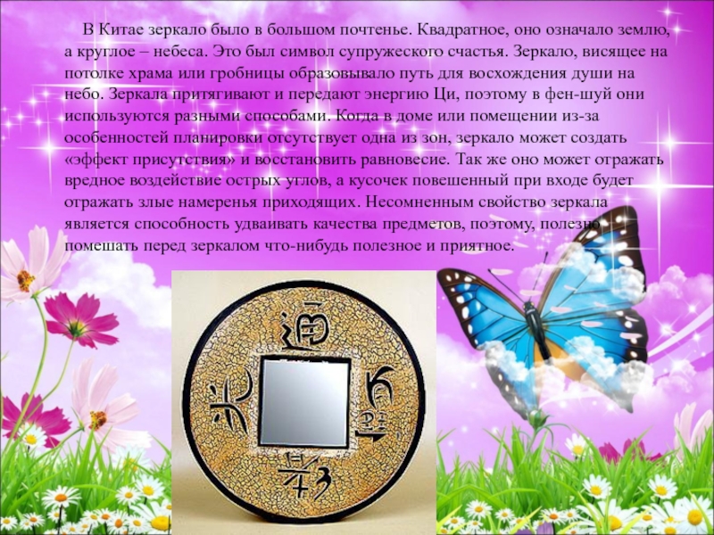 почтенье. Квадратное, оно означало землю, а круглое – небеса. Это был символ супружеского счастья. Зеркало, висящее на потолке храма или гробницы образовывало путь для восхождения души на небо. Зеркала притягивают и передают энергию Ци, поэтому в фен-шуй они используются разными способами. Когда в доме или помещении из-за особенностей планировки отсутствует одна из зон, зеркало может создать «эффект присутствия» и восстановить равновесие. Так же оно может отражать вредное воздействие острых углов, а кусочек повешенный при входе будет отражать злые намеренья приходящих. Несомненным свойство зеркала является способность удваивать качества предметов, поэтому, полезно помешать перед зеркалом что-нибудь полезное и приятное.