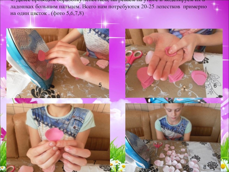 Слайд 224. Далее проводим обработку лепестков, нагреваем на утюге и моделируем их в ладошках