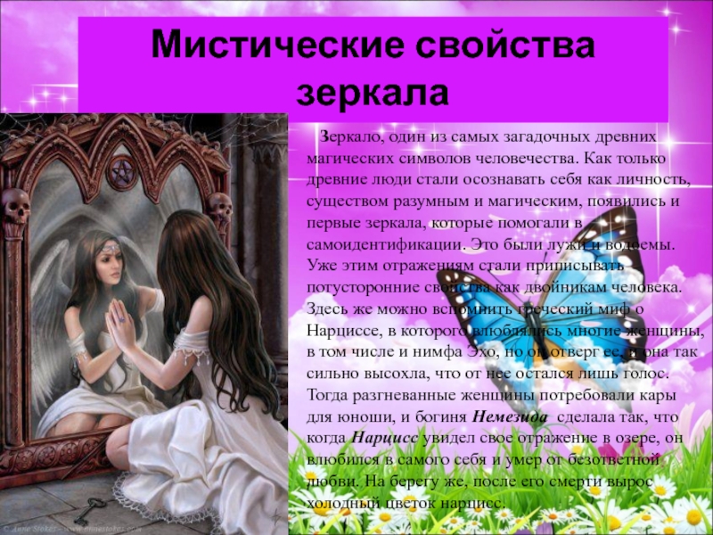 загадочных древних магических символов человечества. Как только древние люди стали осознавать себя как личность, существом разумным и магическим, появились и первые зеркала, которые помогали в самоидентификации. Это были лужи и водоемы. Уже этим отражениям стали приписывать потусторонние свойства как двойникам человека. Здесь же можно вспомнить греческий миф о Нарциссе, в которого влюблялись многие женщины, в том числе и нимфа Эхо, но он отверг ее, и она так сильно высохла, что от нее остался лишь голос. Тогда разгневанные женщины потребовали кары для юноши, и богиня Немезида сделала так, что когда Нарцисс увидел свое отражение в озере, он влюбился в самого себя и умер от безответной любви. На берегу же, после его смерти вырос холодный цветок нарцисс.