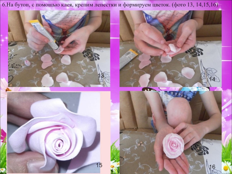 Слайд 246.На бутон, с помощью клея, крепим лепестки и формируем цветок. (фото