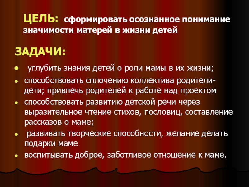 Слайд 6ЦЕЛЬ: сформировать осознанное понимание значимости матерей в жизни детей