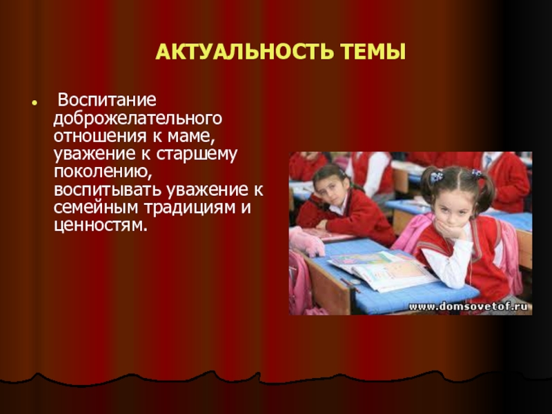 Воспитание доброжелательного отношения к маме, уважение к старшему поколению, воспитывать