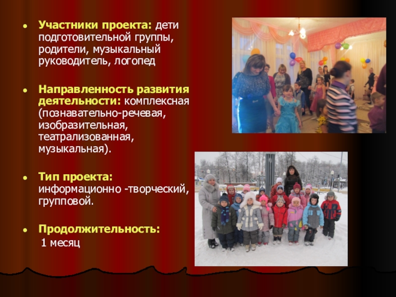 Слайд 9Участники проекта: дети подготовительной группы, родители, музыкальный руководитель, логопед