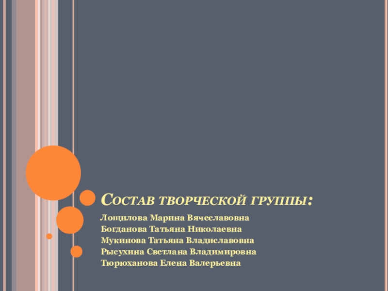 Состав творческой группы:Лощилова Марина ВячеславовнаБогданова Татьяна НиколаевнаМукинова Татьяна ВладиславовнаРысухина Светлана ВладимировнаТюрюханова Елена Валерьевна