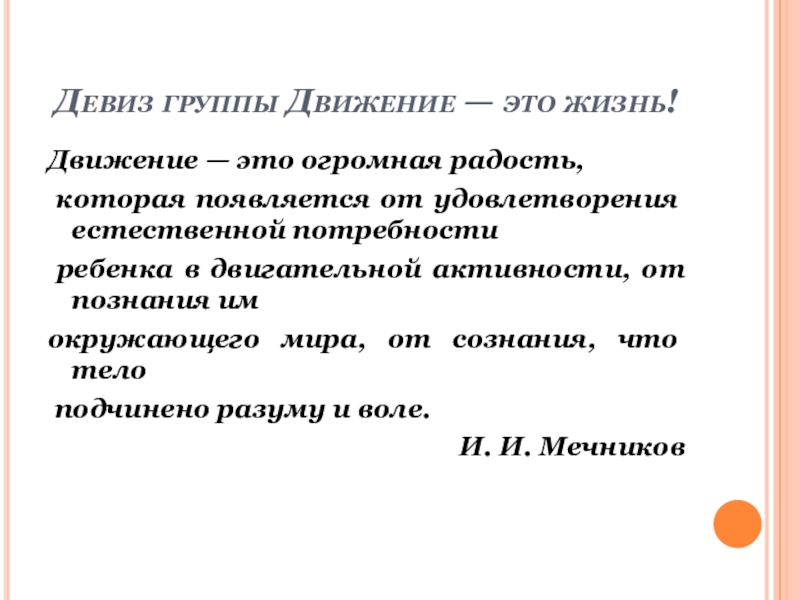 Девиз группы Движение — это жизнь! Движение — это огромная радость, которая появля­ется от удовлетворения естественной потребности ребенка в двигательной активности, от познания имокружа­ющего мира, от сознания, что тело под­чинено разуму и воле.И. И. Мечников
