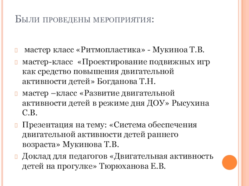 Были проведены мероприятия:  мастер класс «Ритмопластика» - Мукиноа Т.В.мастер-класс «Проектирование подвижных игр как средство повышения двигательной