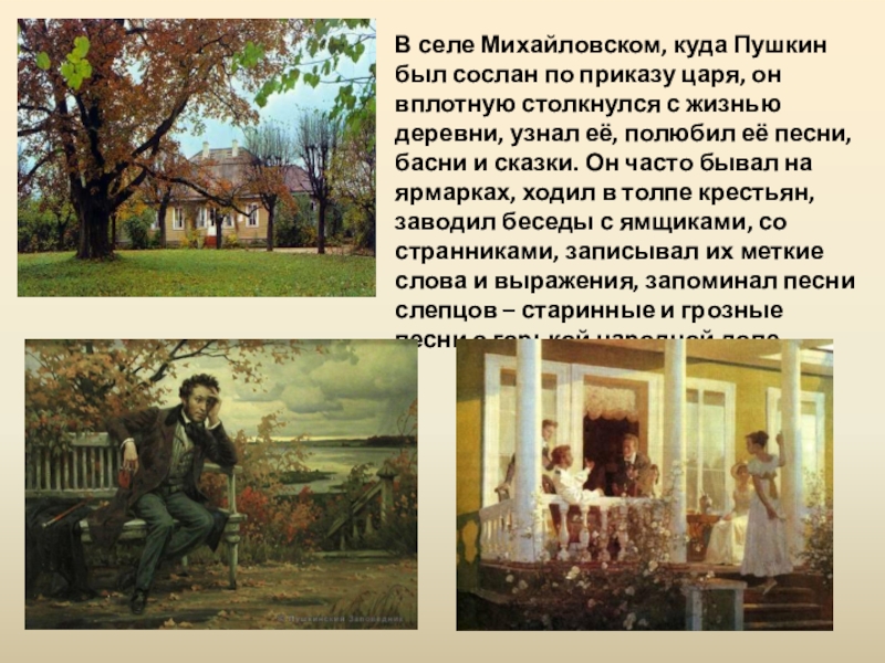 Слайд 5В селе Михайловском, куда Пушкин был сослан по приказу царя, он