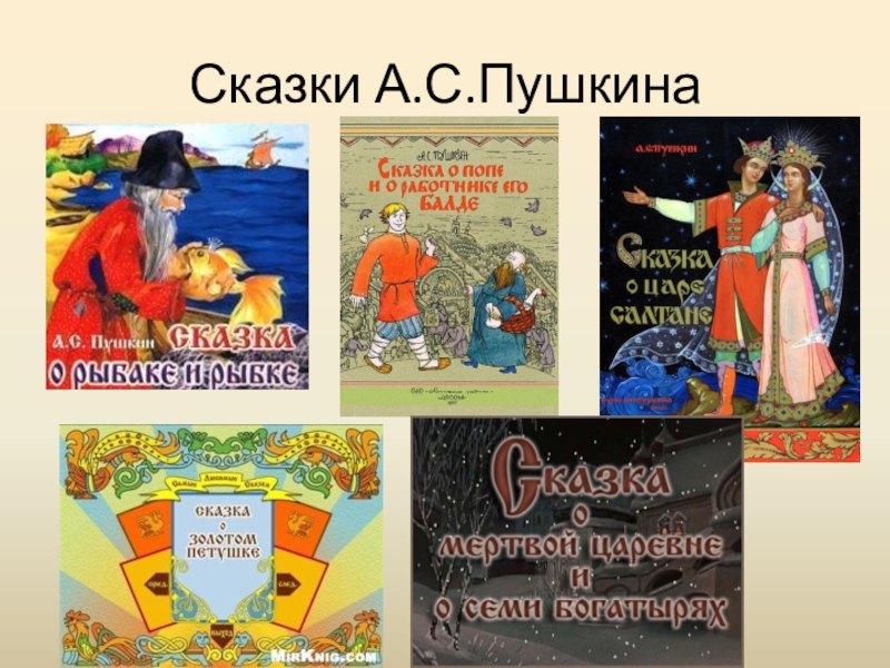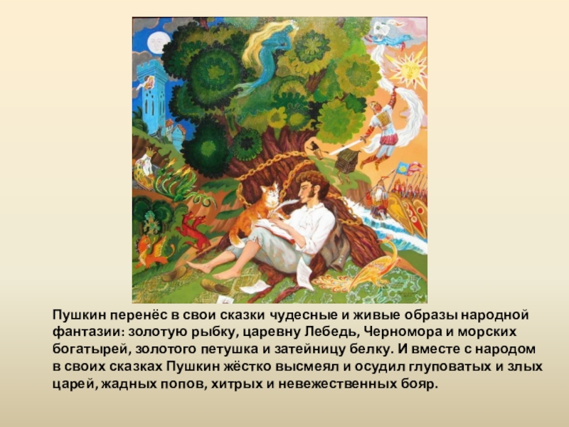 золотую рыбку, царевну Лебедь, Черномора и морских богатырей, золотого петушка и затейницу белку. И вместе с народом в своих сказках Пушкин жёстко высмеял и осудил глуповатых и злых царей, жадных попов, хитрых и невежественных бояр.
