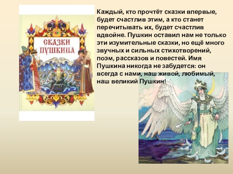 перечитывать их, будет счастлив вдвойне. Пушкин оставил нам не только эти изумительные сказки, но ещё много звучных и сильных стихотворений, поэм, рассказов и повестей. Имя Пушкина никогда не забудется: он всегда с нами, наш живой, любимый, наш великий Пушкин!