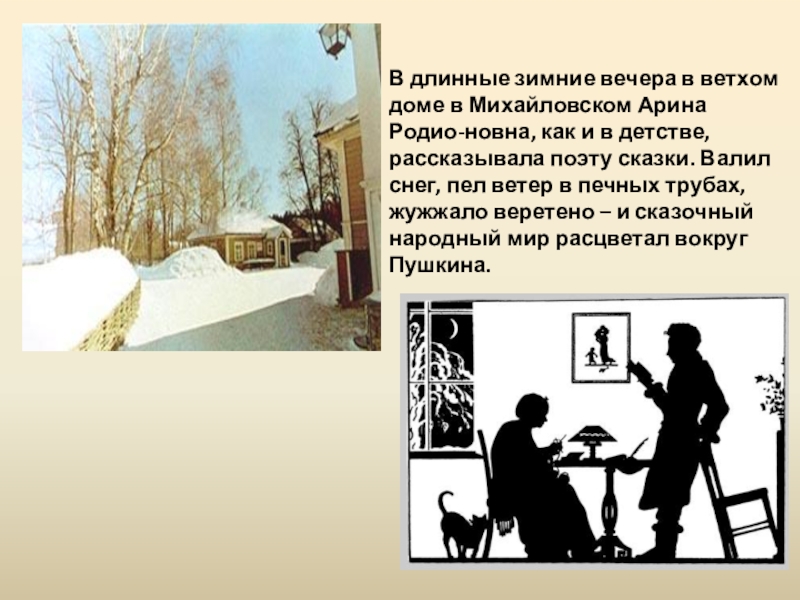 как и в детстве, рассказывала поэту сказки. Валил снег, пел ветер в печных трубах, жужжало веретено – и сказочный народный мир расцветал вокруг Пушкина.