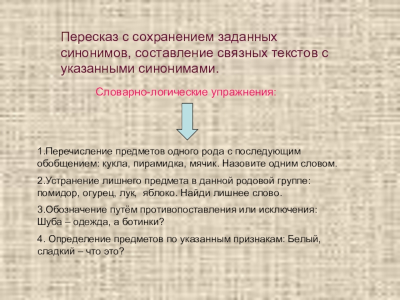 1.Перечисление предметов одного рода с последующим обобщением: кукла, пирамидка, мячик. Назовите одним словом.