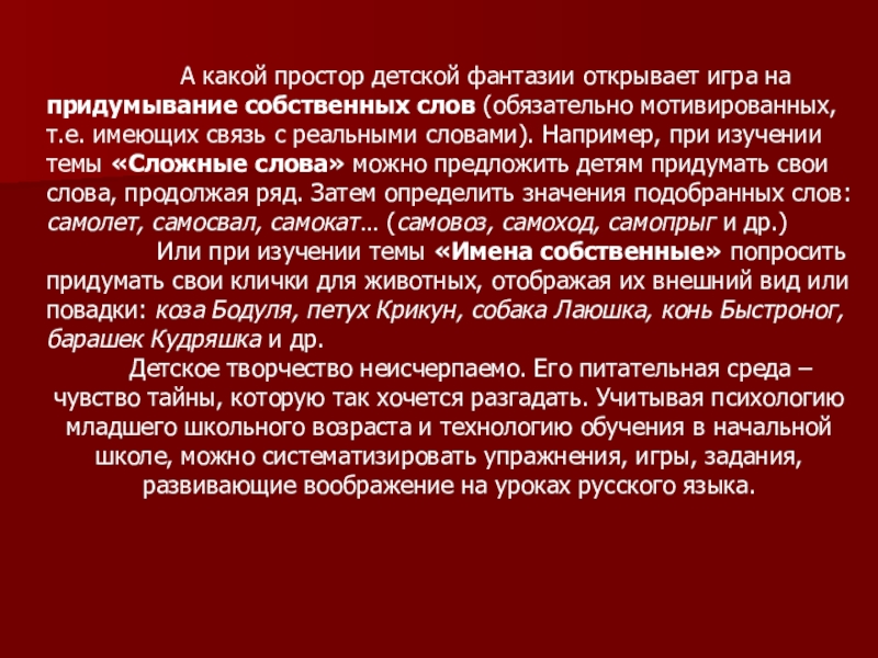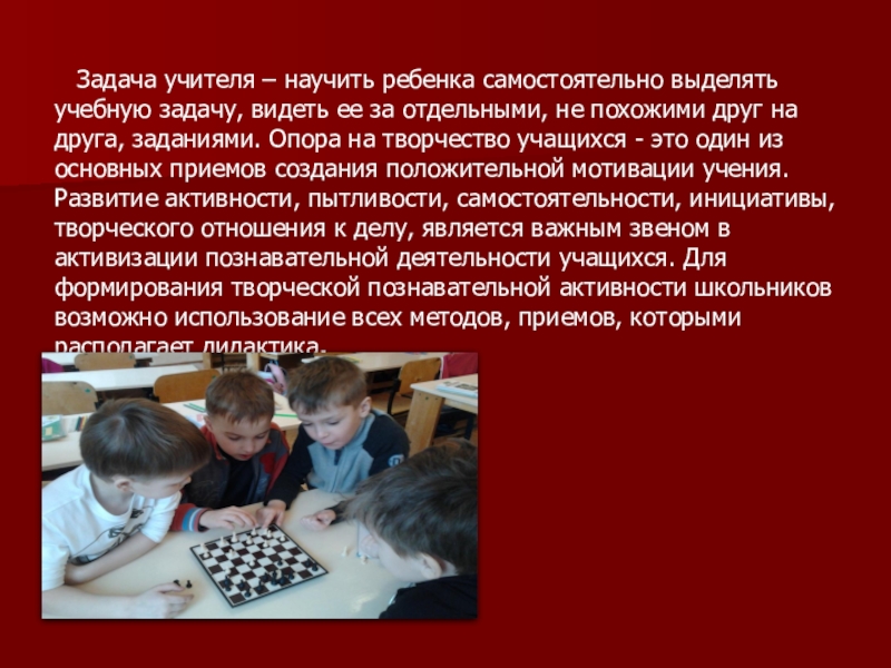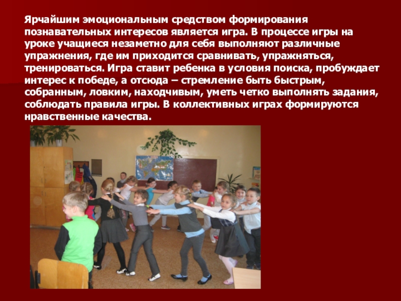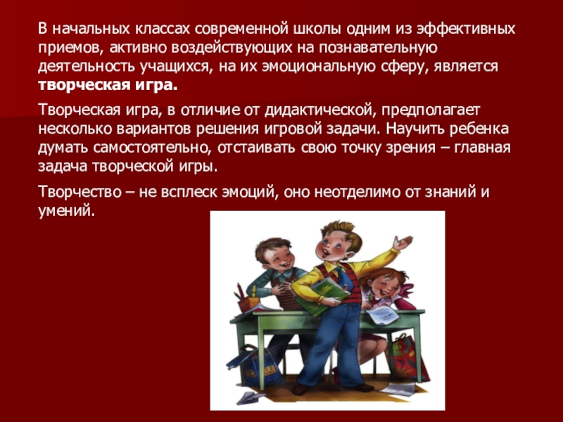 В начальных классах современной школы одним из эффективных приемов, активно воздействующих на познавательную деятельность учащихся, на их эмоциональную сферу, является творческая игра.