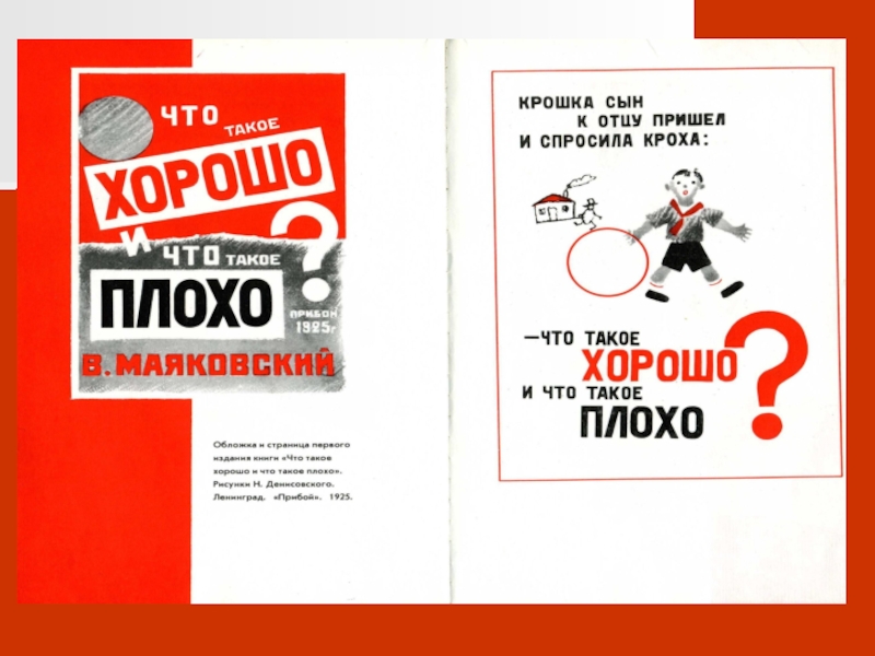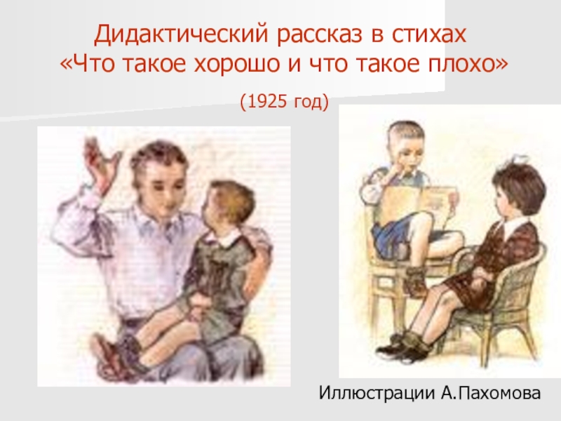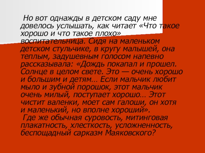 «Что такое хорошо и что такое плохо» воспитательница. Сидя на маленьком детском стульчике, в кругу малышей, она теплым, задушевным голосом напевно рассказывала: «Дождь покапал и прошел. Солнце в целом свете. Это — очень хорошо и большим и детям… Если мальчик любит мыло и зубной порошок, этот мальчик очень милый, поступает хорошо… Этот чистит валенки, моет сам галоши, он хотя и маленький, но вполне хороший».