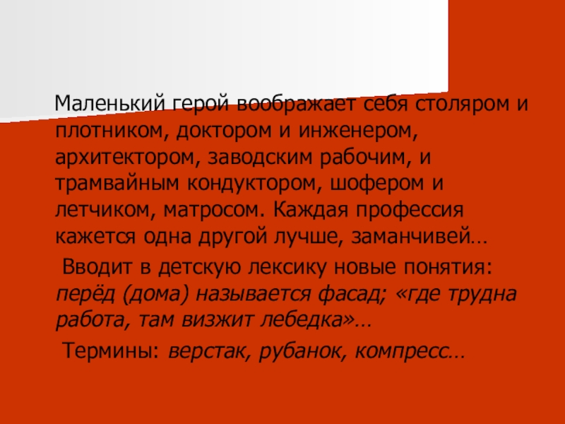 Вводит в детскую лексику новые понятия: перёд (дома) называется фасад; «где трудна работа, там визжит лебедка»…