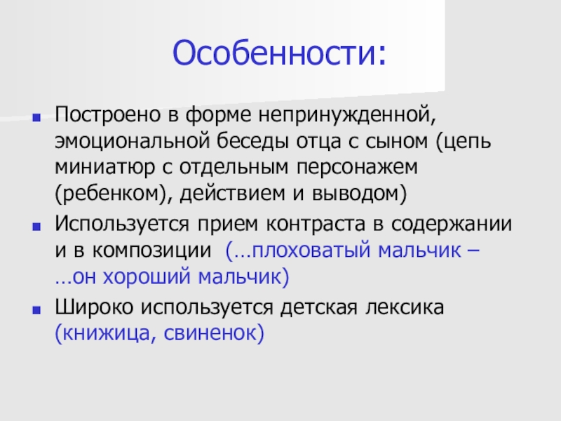 Построено в форме непринужденной, эмоциональной беседы отца с сыном (цепь миниатюр