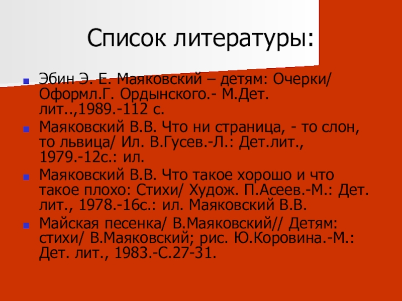 Эбин Э. Е. Маяковский – детям: Очерки/ Оформл.Г. Ордынского.- М.Дет.лит..,1989.-112