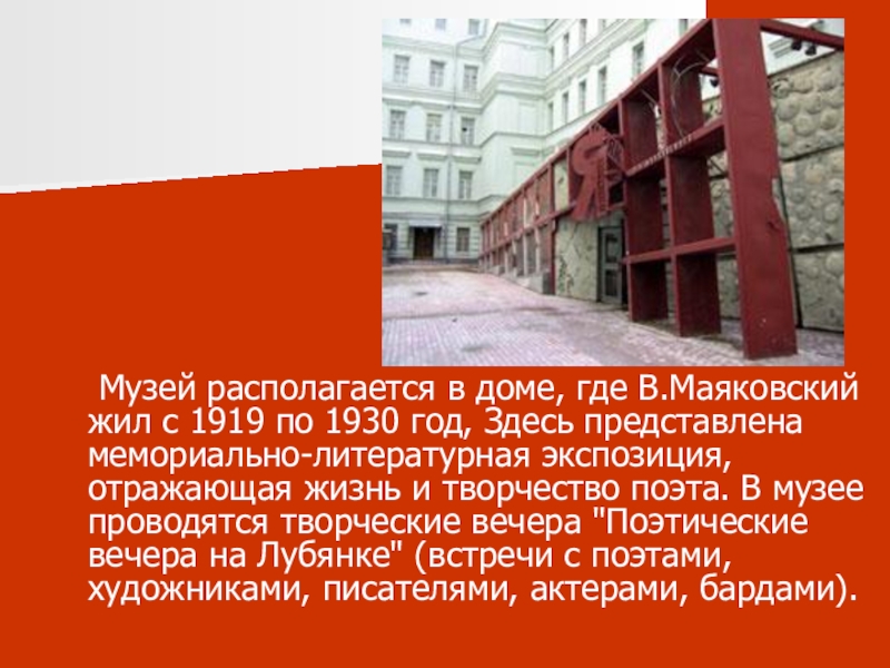 Слайд 21 Музей располагается в доме, где В.Маяковский жил с 1919 по 1930