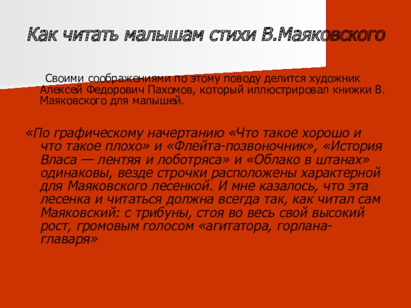 «По графическому начертанию «Что такое хорошо и что такое плохо» и «Флейта-позвоночник», «История Власа — лентяя и лоботряса» и «Облако в штанах» одинаковы, везде строчки расположены характерной для Маяковского лесенкой. И мне казалось, что эта лесенка и читаться должна всегда так, как читал сам Маяковский: с трибуны, стоя во весь свой высокий рост, громовым голосом «агитатора, горлана-главаря»