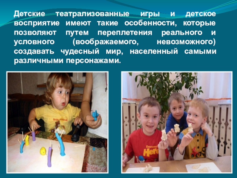 Слайд 13Детские театрализованные игры и детское восприятие имеют такие особенности, которые позволяют