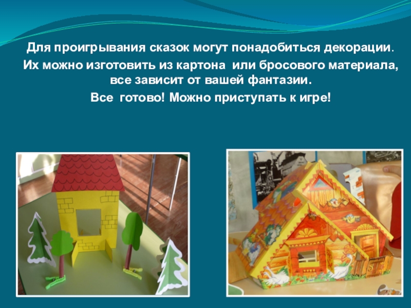 Слайд 28Для проигрывания сказок могут понадобиться декорации.