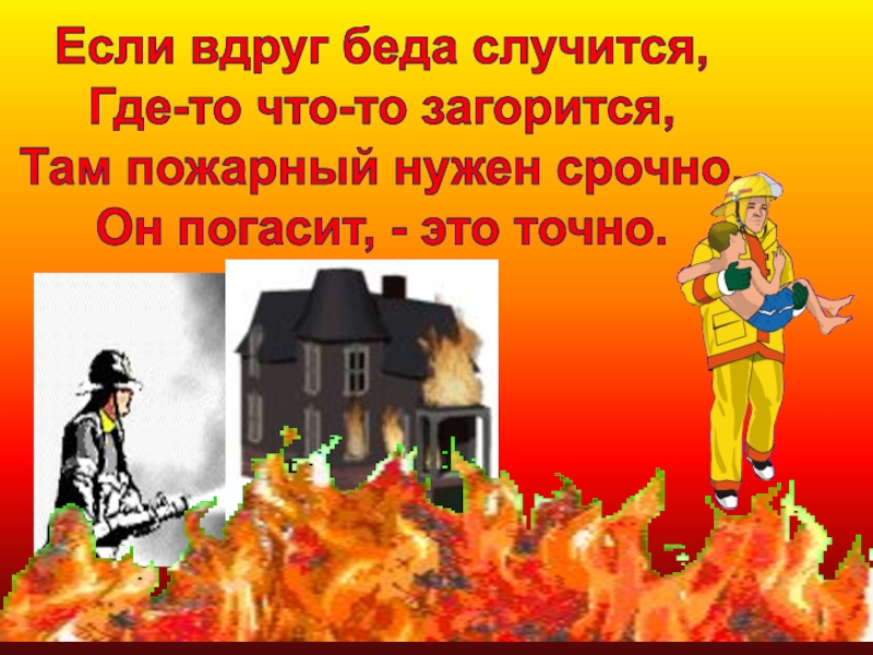 Слайд 3Если вдруг беда случится, Где-то что-то загорится, Там пожарный нужен срочно. Он погасит, -