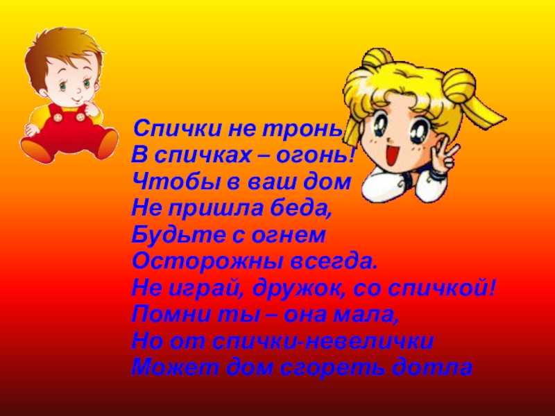 Спички не тронь, В спичках – огонь! Чтобы в ваш дом Не пришла беда, Будьте