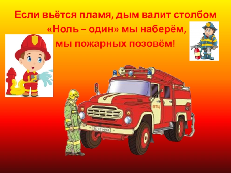 Если вьётся пламя, дым валит столбом «Ноль – один» мы наберём, мы пожарных позовём!