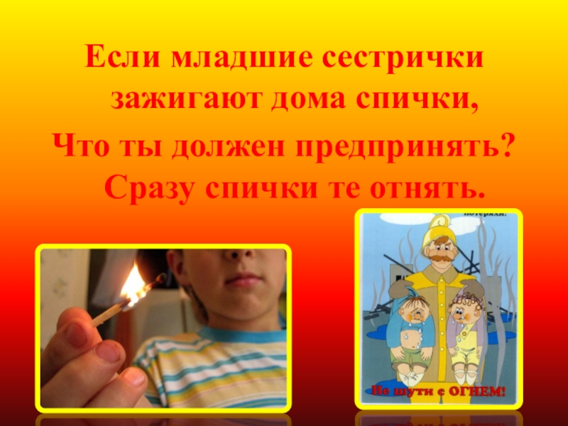 Если младшие сестрички зажигают дома спички,Что ты должен предпринять? Сразу спички те отнять.