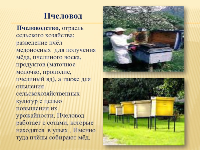 Слайд 11 Пчеловодство, отрасль сельского хозяйства; разведение пчёл медоносных