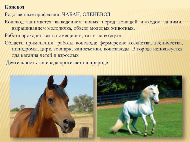 Коневод занимается выведением новых пород лошадей и уходом за ними,