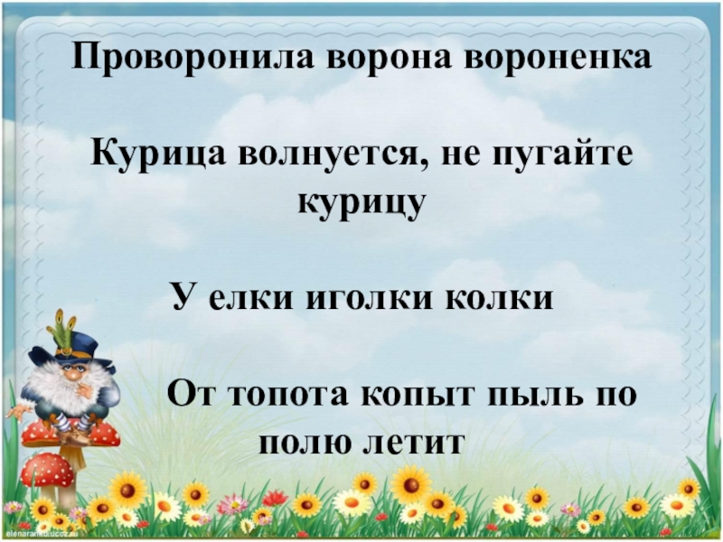 Слайд 23Проворонила ворона вороненка Курица волнуется, не пугайте курицу У елки иголки колки