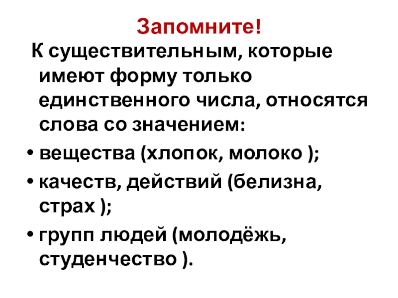 Обязательно запомните лексические группы слов, имеющих форму только единственного числа, и правильно употребляйте их в речи.