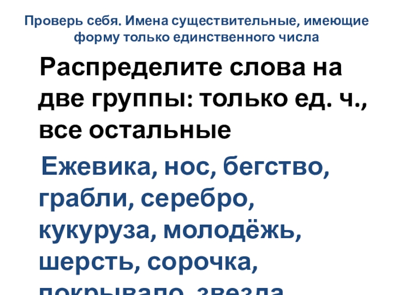 Слайд 10Проверь себя. Имена существительные, имеющие форму только единственного числа