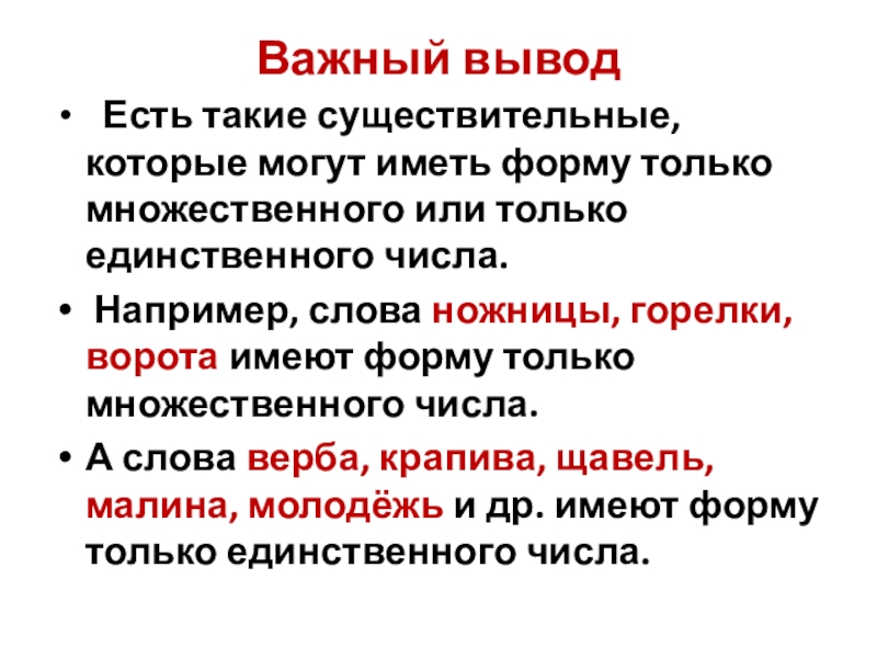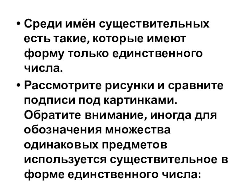 Слайд 5Среди имён существительных есть такие, которые имеют форму только единственного числа.