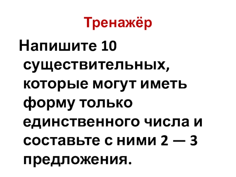 Слайд 9Тренажёр. Выделите существительные, которые имеют форму только единственного числа.