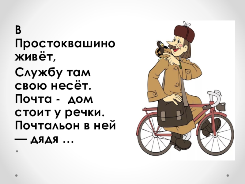 В Простоквашино живёт, Службу там свою несёт. Почта - дом стоит у речки. Почтальон в ней —