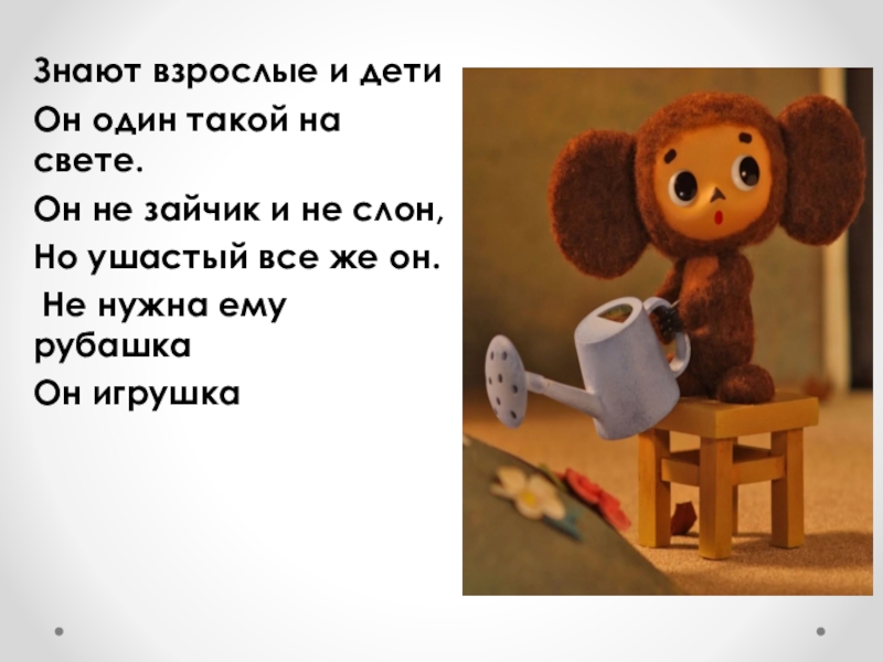 Знают взрослые и дети Он один такой на свете. Он не зайчик и не слон, Но ушастый все же он. Не нужна ему рубашка Он игрушка