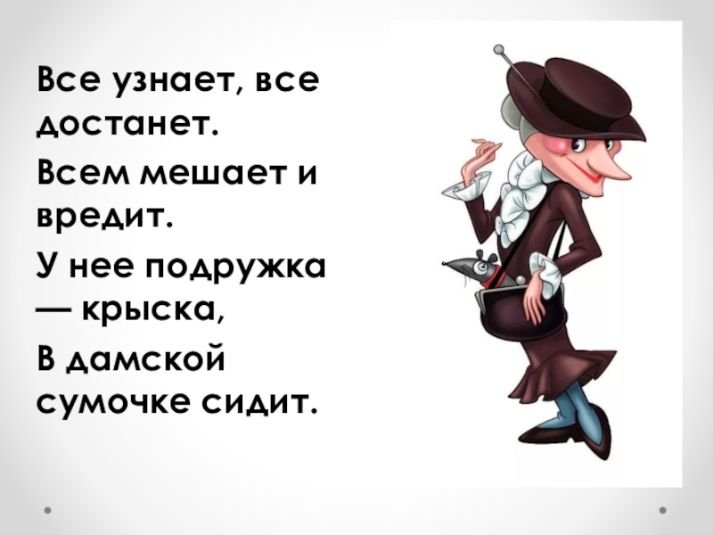Все узнает, все достанет. Всем мешает и вредит. У нее подружка — крыска, В дамской сумочке сидит.