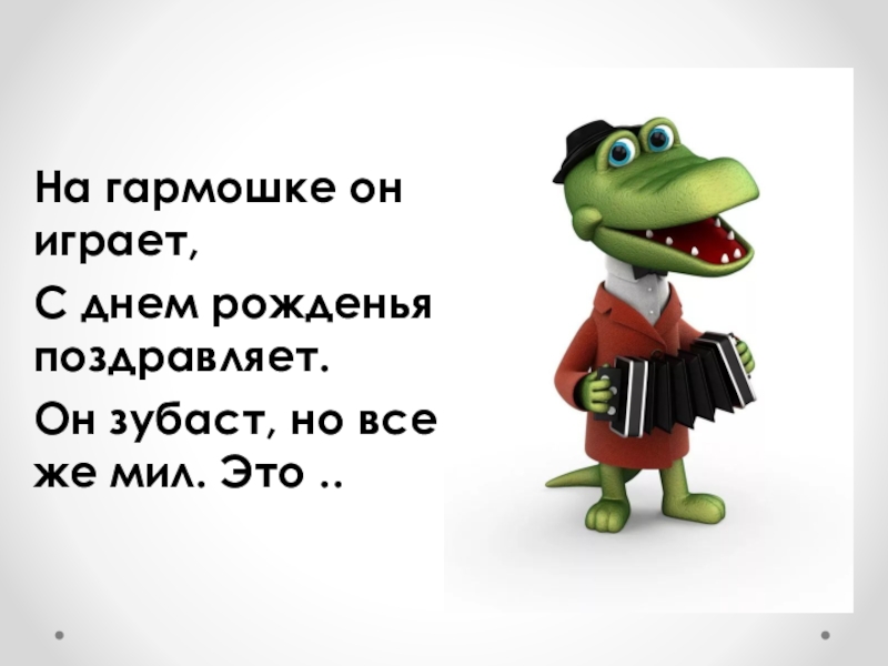 На гармошке он играет, С днем рожденья поздравляет.Он зубаст, но все же мил. Это ..
