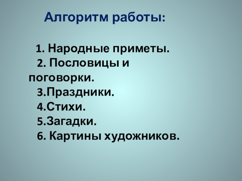 Алгоритм работы:   1. Народные приметы.  2. Пословицы и поговорки.  3.Праздники.  4.Стихи.