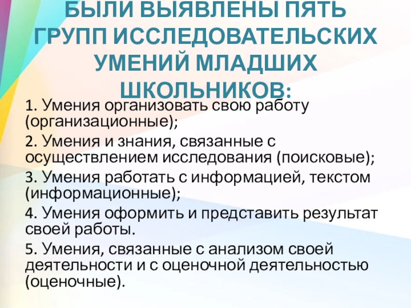 Слайд 18Были выявлены пять групп исследовательских умений младших школьников: