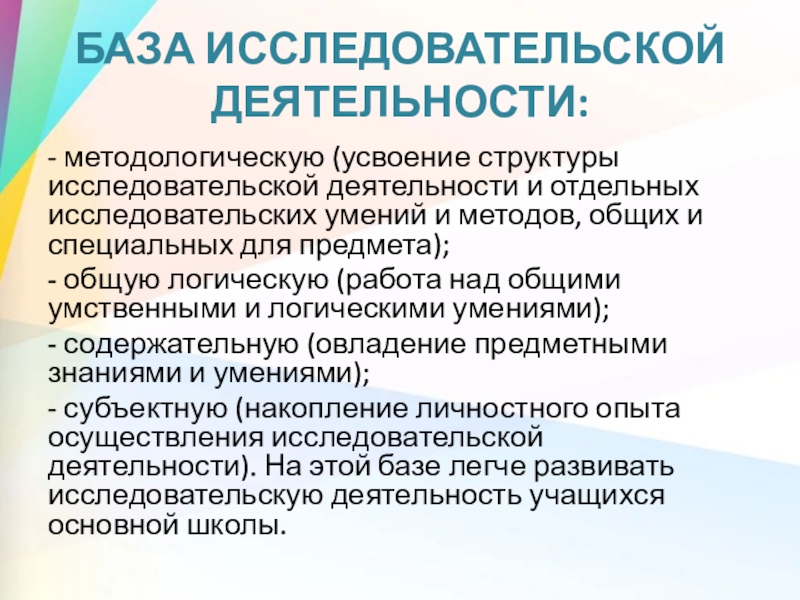 - субъектную (накопление личностного опыта осуществления исследовательской деятельности). На этой базе легче развивать исследовательскую деятельность учащихся основной школы.