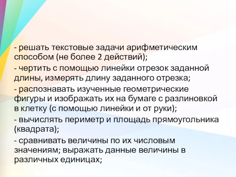 Слайд 12- решать текстовые задачи арифметическим способом (не более 2 действий);