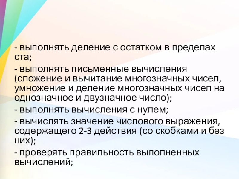 Слайд 11- выполнять деление с остатком в пределах ста;