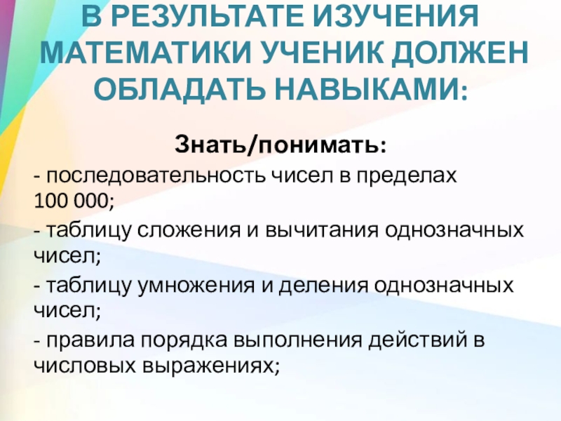 Слайд 9В результате изучения математики ученик должен обладать навыками: