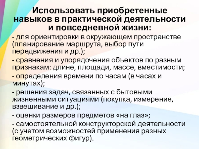 Слайд 13Использовать приобретенные навыков в практической деятельности и повседневной жизни: