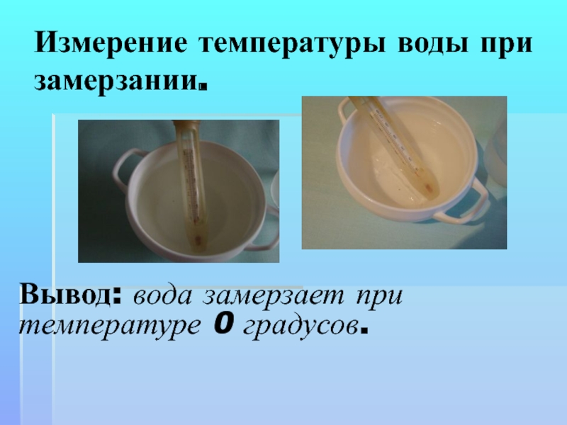 формочки. Поставь их в морозильную камеру. Наблюдай, когда на поверхности воды появятся льдинки. Измерь ещё раз температуру воды.