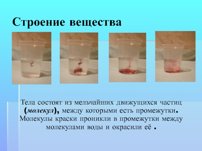 промежутки. Молекулы краски проникли в промежутки между молекулами воды и окрасили её .