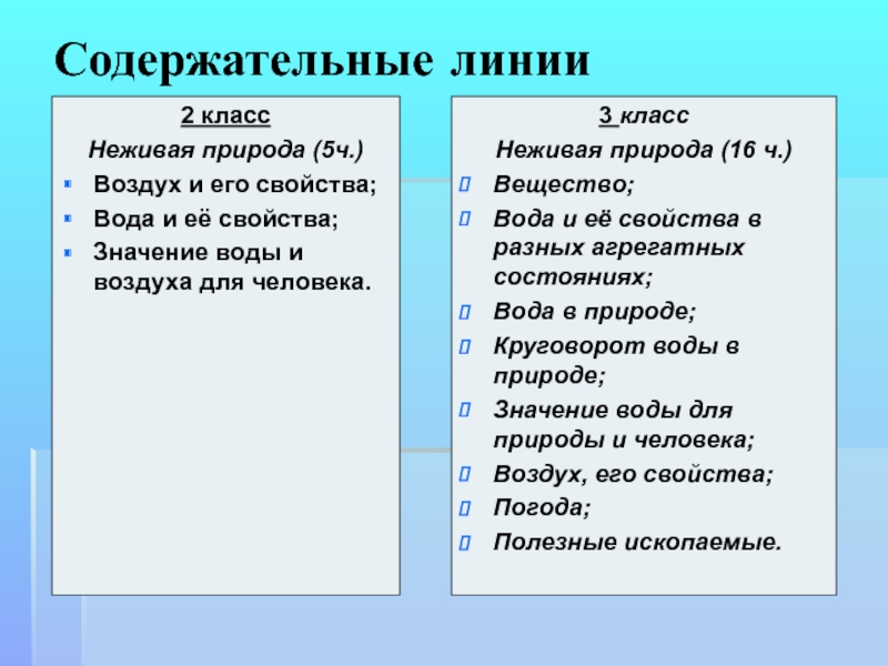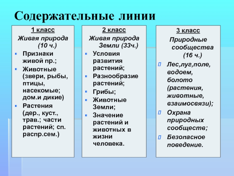 Рассматривается значение каждого природного компонента в жизни людей, анализируется положительное и отрицательное воздействие человека на эти компоненты. Важнейшее значение для осознания детьми единства природы и общества, целостности самого общества, теснейшей взаимозависимости людей имеет включение в программу сведений из области экономики, истории, современной социальной жизни, которые присутствуют в программе каждого класса.